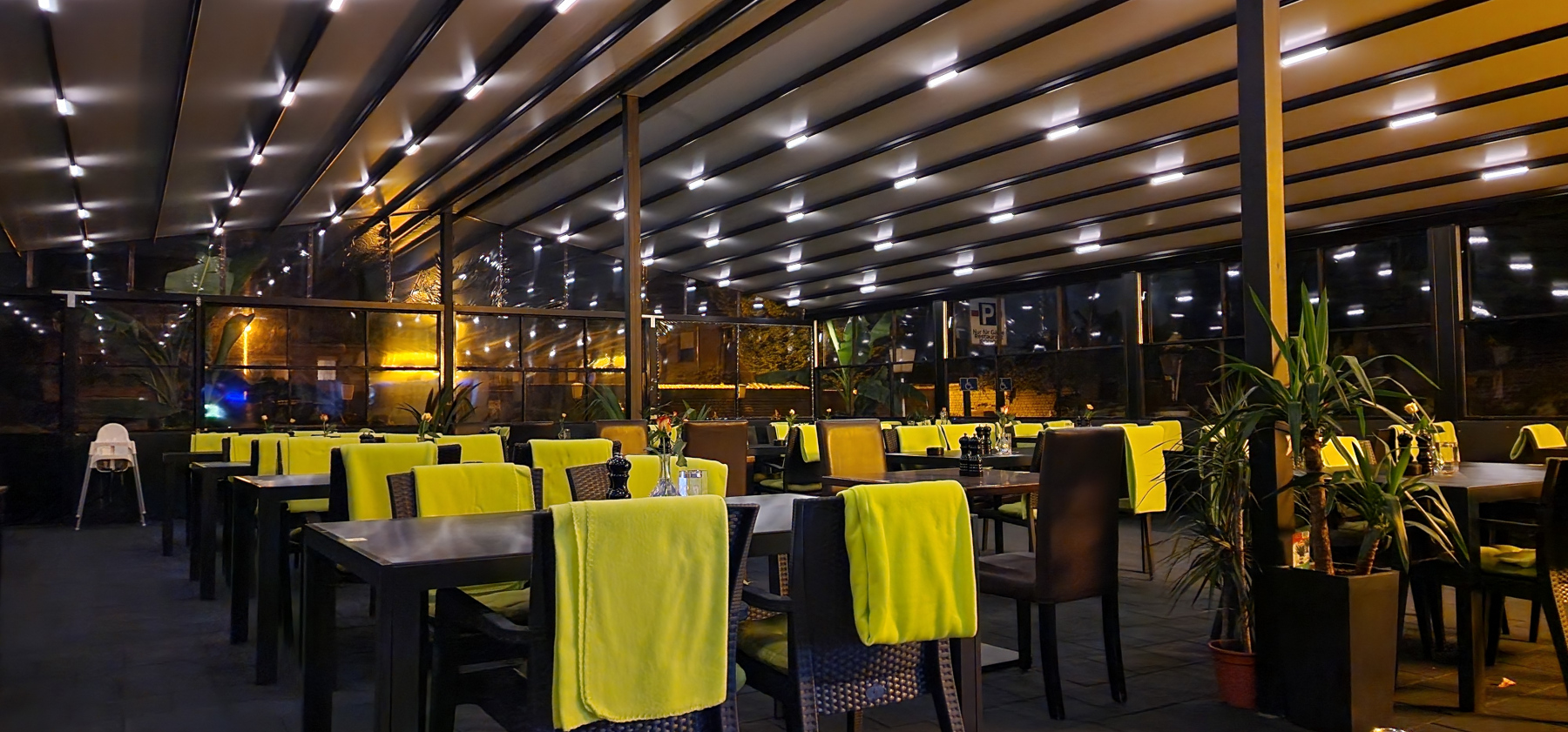 Unser 180qm großer Biergarten mit elektrischem Dach, das je nach Witterung und Jahreszeit schnell geöffnet und geschlossen werden kann, bietet Platz für bis zu 140 Gäste. Ebenso können die Seitenwände flexibel geöffnet und geschlossen werden. Somit sitzen unsere Gäste windgeschützt in der Sonne oder im Trockenen.